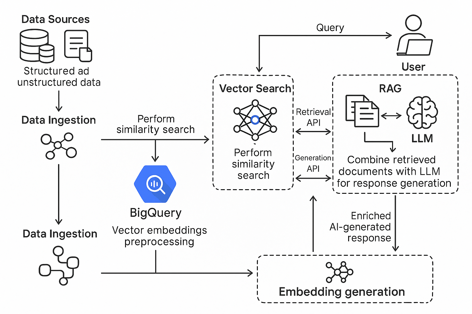 One way this can help in real life is by making it easier to handle company info. A business may have lots of FAQs, tech manuals, and support tickets all over the place. With BigQuery, the company can set up a smart system that lets people search for what they need. Now, if an employee asks a question using natural language, the system finds answers from many different documents. Then, it gives a clear, simple answer in steps.